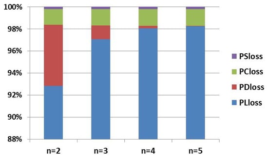 The power loss of inductor accounts for the largest proportion of total loss, and the proportion will increase as n increases, while the proportion of diode conduction loss decreases as the n increases. and remain unchanged as the n increases.