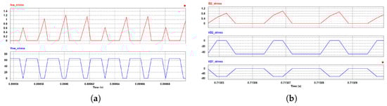Set D a fixed value of 0.35, and calculate and when . As shown in Figure 7a, we set a fixed value of 10 V to observe that , and have the first and second largest voltage stress, respectively. As shown in Figure 7b, we set a fixed value of 1 A to observe that , and have the largest current stress.
