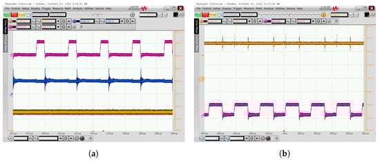The duty ratio D is 0.25, and the switching frequency f is 62,000 Hz. The Arduino Uno converts the input voltage (0–5 V) to the digital signal (0–255), and then outputs the PWM control signal after the PI control program proceeding. The and of the PI controller used in the experiment was 0.001 and 1.1, respectively. The experimental result waveforms are shown in Figure 13. The waveforms of the input voltage , output voltage and drive signal PWM in open loop are shown in Figure 13a. As shown in Figure 13b, in the experimental results, is close to the theoretical result of 12.64 V.