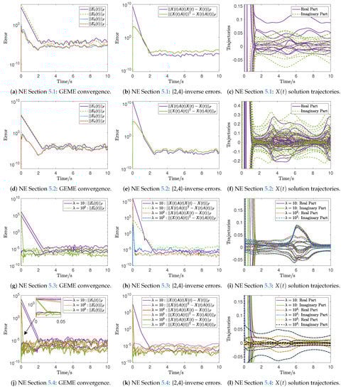 Furthermore, the {2,4}-inverse errors of the ZNN24I model are depicted in Figure 1b,e,h,k for the NEs in Section 5.1, Section 5.2, Section 5.3, Section 5.4, respectively, and the {2,3}-inverse errors of the ZNN23I model are depicted in Figure 2b,e,h,k for the NEs in Section 5.1, Section 5.2, Section 5.3, Section 5.4, respectively. In all these figures, we observe that the error begins at in the range , but it ends in different periods t depending on the value of , while its lowest values depend on the relative error tolerance value defined in ode15s. In other words, the {2,3}- and {2,4}-inverse errors of the ZNN23I and ZNN24I models exhibit the same convergence tendency as their associated GEMEs. Finally, the solution trajectories of the ZNN24I model are depicted in Figure 1c,f,i,l for the NEs in Section 5.1, Section 5.2, Section 5.3, Section 5.4, respectively, and the solution trajectories of the ZNN23I model are depicted in Figure 2c,f,i,l for the NEs in Section 5.1, Section 5.2, Section 5.3, Section 5.4, respectively. In all these figures, we observe that a particular pattern emerges in the {2,3}- and {2,4}-inverse trajectories before for , before for , and before for .
