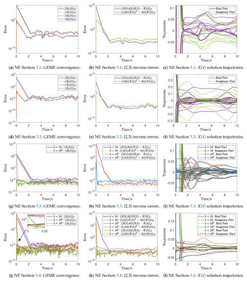 for the ZNN23I model, whereas the matrices F and G are generated through MATLAB function randn with . We also used the functions and in the declaration of the input matrix . During the computation of all NEs, the MATLAB solver ode15s is used under the time interval . Additionally, for the NEs in Section 5.1 and Section 5.2, ode15s was utilized with the default relative error tolerance of , whereas for the NEs in Section 5.3 and Section 5.4, the relative error tolerance was set to . Finally, the ZNN design parameter was set to for the NEs in Section 5.1 and Section 5.2, in Section 5.3, and in Section 5.4.