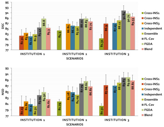 With respect to FL-Cov, average DSCs show great improvements of 2% for Institution 1, 2% for Institution 2, and 3.5% for Institution 3 over the Cross-learning schema for every institution, and DSC improvements of 2–5% over the Independent and Ensemble schemas. Similarly, the average NSDs achieved by FL-Cov present significant improvements (2.1% for Institution 1, 2.5% for Institution 2, 3.25% for Institution 3) over Ensemble learning. NSD of FL-Cov was greatly improved (2–3%) over the Independent and Ensemble schemas. Compared to FL-Cov, FGDA improved DSC on Institution 1 and Institution 2 by 1.7% (p-value: 0.04416) and 0.7% (p-value: 0.02227), respectively, and reduced the DSC of Institution 3 by 1%. Similarly, the NSD of FGDA was improved by 1.9% (p-value: 0.03562) and 0.2% (p-value: 0.01463) on Institution 2 and Institution 3, respectively, but decreased by 1.5%. Compared to Ensemble settings, FGDA improved DSC by 3.4% (p-value: 0.04085) on Institution 1, and realized equal and less DSC on Institution 1 and Institution 2, respectively. Similarly, the FGDA improved the NSD by 1% on both Institution 1 (p-value: 0.03735) and Institution 2 (p-value: 0.03678) and was comparable on Institution 3 when compared to FL-Cov. The observed behaviour of the DA technique might depend on the data distribution at different institutions.