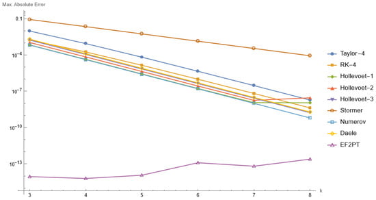 Problem (21) has two complex conjugate frequencies, which are and , and have been studied by Refs. [6,12,21]. Here, we solve this problem using a different steplength h on the interval , and the maximum absolute error for each steplength is obtained and presented in Figure 2.