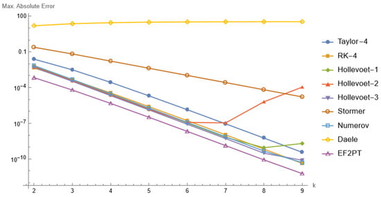 Maximum absolute errors for Problem 2 as a function of the stepsize .