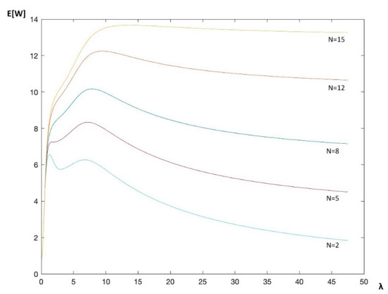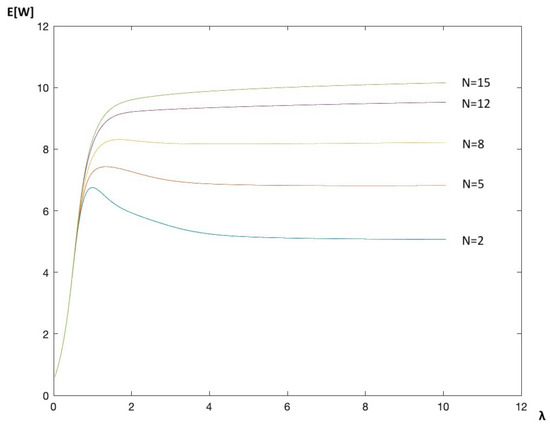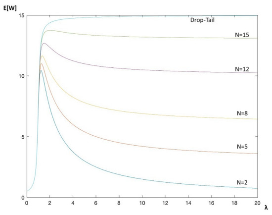 First, we considered the push-out scheme with Poisson input. The arrival rate varied between 0 and 20. Figure 1 shows the average waiting time for served customers for variable push-out parameter , , together with the corresponding result for the Drop-Tail strategy (i.e., when a customer arriving at a full buffer was dropped). The average waiting time increased clearly with the increasing value of , with average waiting time for the Drop-Tail strategy as an upper bound. These results correspond to the results obtained in [1] for . The difference between the two models in terms of E[W] for N = 2 is very small indeed. If the load was high, then the server only exceptionally took a vacation and hence the difference between the models was negligible in this case. In cases where the load was low, the server took vacations when, at the end of a service, the system was empty. However, unless the vacation was very long, the probability that the queue was full, and hence a push-out occurred, was extremely low. Hence, only if the vacation was long enough and the load was such that vacations occurred with non-negligible probability, and such that the queue was full at the end of a vacation, was the difference between the two models noticeable. However, even in that case, the difference was small as the models only differ in one buffer place, which was the candidate to be pushed out.