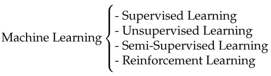 Machine learning (ML) aims to analyze data in the search of patterns and to develop predictions obtaining future results []; when decomposing ML, we can find four main types (Figure 1): supervised, unsupervised, semi-supervised, and reinforcement learning (RL). In RL, an agent receives a set of instructions, actions, or guidelines with which it will then make its own decisions based on a process of reward and penalty to guide the agent toward the optimal solution to the problem.