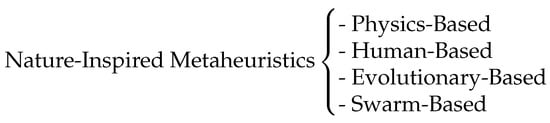 A high percentage of MHs are nature-based; this is mainly because their development is based on some abstraction of nature. The existing taxonomy can be defined in various ways and in various sections of the MH if one wanted to dissect; at first, they can be classified as those based on the trajectory or based on population. A popular classification can be those presented by [,], decomposing the population-based ones into 4 main categories: physics-based, human-based, evolutionary-based and swarm-based (Figure 2). Furthermore, the taxonomy presented in [] deepens in the main components that conform to these algorithms: the solution evaluation, parameters, encoding, initialization of the agents or the population, management of the population, operators, and finally, local search.