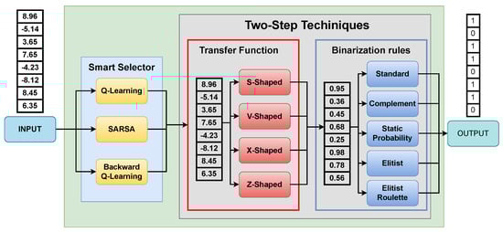 In this work, we propose a new intelligent operator using a binarization scheme selection (BSS) capable of adapting any continuous MHs to work in the binary domain. BSS is based on the two-step technique, where employing an intelligent operator, the transfer function, and the binarization rules to be used are chosen; this scheme was first proposed in []. BSS has been previously used with reinforcement learning techniques within the machine learning umbrella: Q-learning and SARSA; in this case, a new intelligent operator called backward Q-learning (BQSA) [] is presented, which is a combination between Q-learning and SARSA, updating the Q-values by SARSA and in a delayed way with Q-learning. On the other hand, the set of schemes of this proposal is more extensive, going from 40 possible combinations to 80. All of the above points to the need to investigate hybrid methods to improve the algorithm’s performance. The contributions made as a result of this work are presented below: