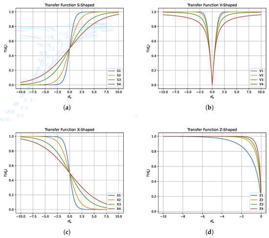 Transfer functions. (a) S-shaped; (b) V-shaped; (c) X-shaped; (d) Z-shaped.