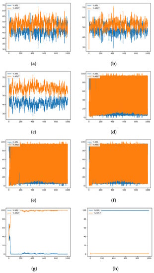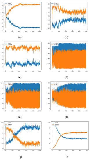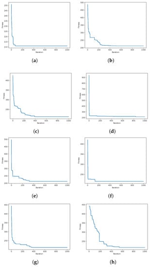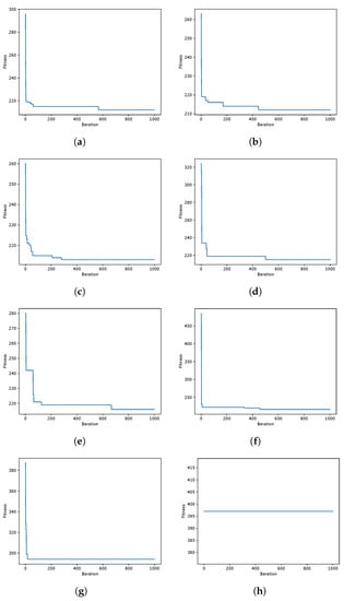 GWO instances coverage when resolving the scp55 instance of the SCP. Instance Optimum: 211. (a) 80aBQSA—fitness obtained 211—Instance 55; (b) 80aQL—fitness obtained 212—Instance 55 (c) 80aSA—fitness obtained 212—Instance 55; (d) 40aBQSA—fitness obtained 212—Instance 55; (e) 40aQL—fitness obtained 213—Instance 55; (f) 40aSA—fitness obtained 212—Instance 55; (g) BCL—fitness obtained 212—Instance 55; (h) MIR—fitness obtained 216—Instance 55.