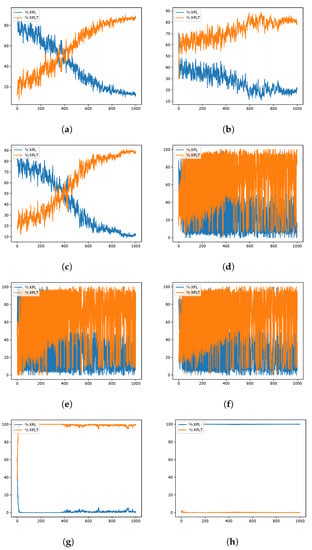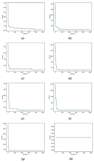 During the experimentation, several data from the optimization process were recorded, such as the fitness obtained in iteration and the diversity among individuals as presented in [,], in order to analyze their behavior during the iterations. A graphical representation is the convergence graphs shown in Figure 5, Figure 6 and Figure 7, where the X axis corresponds to the 1000 iterations, while the Y axis presents the best fitness obtained up to that iteration. The graphs correspond to the best runs for representative instances, and the fitness value found is recorded in the subtitle of each graph, while in the graph set title, the known optimum is presented in order to make a simpler comparison. Other representations are the exploration and exploration graphs, presented in Figure 8, Figure 9 and Figure 10, where on the X-axis, the iterations are presented while on the Y-axis, the exploration (XPL) and exploitation (XPLT) are displayed.