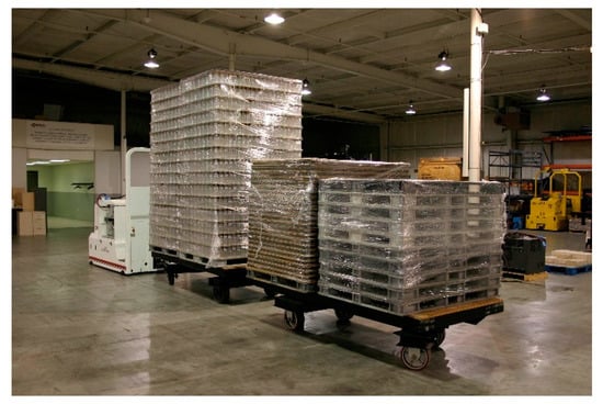 - AGVExpertJS. Tugger AGV Towing Multiple Trailers in a Warehouse. Environment. 2022. Available online: https://en.wikipedia.org/wiki/Automated_guided_vehicle#/media/File:Tugger_AGV_with_trailers,_courtesy_of_Egemin_Automation_Inc..jpg (accessed on 24 August 2022).