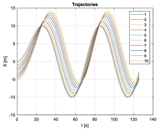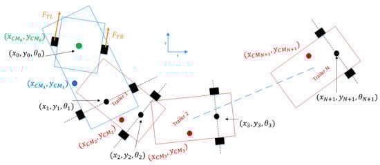 The position of the AGV is given by and the location of its center of mass in the inertial frame by . Additionally, it may be observed in Figure 2 that the position of the -trailer is represented by , and its center of gravity by . As the vehicle may have trailers, the position of the last trailer is given by .