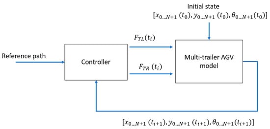 In the closed-loop scheme, the objective of the multi-trailer AGV modeling iterative algorithm is to calculate the new state of the AGV and the trailers given the past state of the AGV and trailers, , and the application of a pair of external forces, [], obtained by the controller. The controller receives this new state and calculates the new forces, []. This process is iteratively performed during the simulation time .