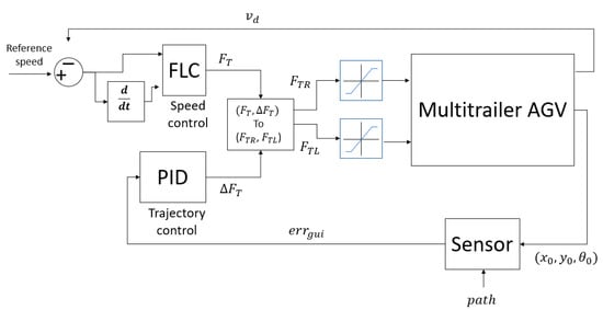 Figure 4 shows a control scheme for the implementation of Algorithm 2. It is possible to observe that the multi-trailer AGV receives the references for the traction forces of the left and right wheels, and . The guiding sensor calculates the guiding error, , considering the location of the AGV and the path. This signal is used by the trajectory PID control to generate the reference . On the other hand, the speed of the AGV, feeds the speed PID controller which obtains the signal . Both signals, and are used to calculate the references for the wheels, and .