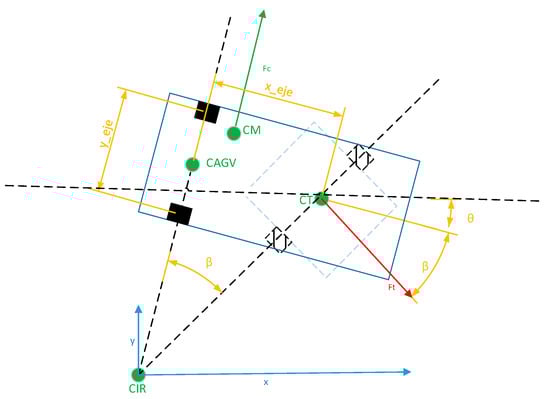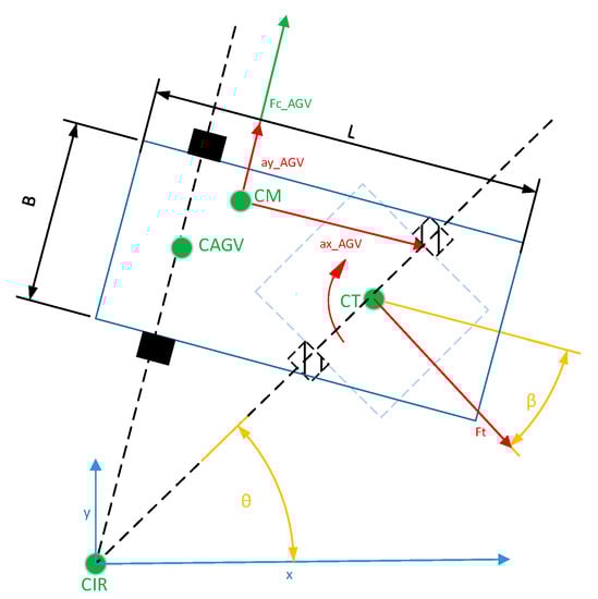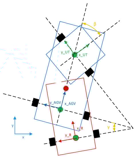 The kinematic model of the two AGVs is normally based on a differential robot or a tricycle one. In our case, to make the approach more general, we have used a hybrid AGV that combines both. That is, the traction unit moves similar to a differential robot, whose center is given by coordinates (see Figure 2, blue rectangle), where and , are the x-axis and y-axis coordinates, and is the orientation in the inertial frame. This unit is linked to the body of the AGV and rotates around a pivot shaft (green circle, Figure 2). The center of gravity has been located at the center of the traction unit as this is the standard approach, thus matches with . The traction unit acts as the steering wheel in a tricycle, and so the body of the AGV moves similar to a tricycle robot.