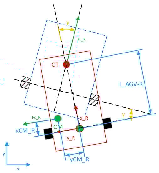 Unlike these papers, we applied the Newton–Euler approach to obtain the model equations. In general, the Newton–Euler approach provides models with lower computational complexity than Lagrange–Euler. In addition, these works deal with a tricycle configuration AGV instead of a more complex hybrid differential-tricycle one, as in our case.