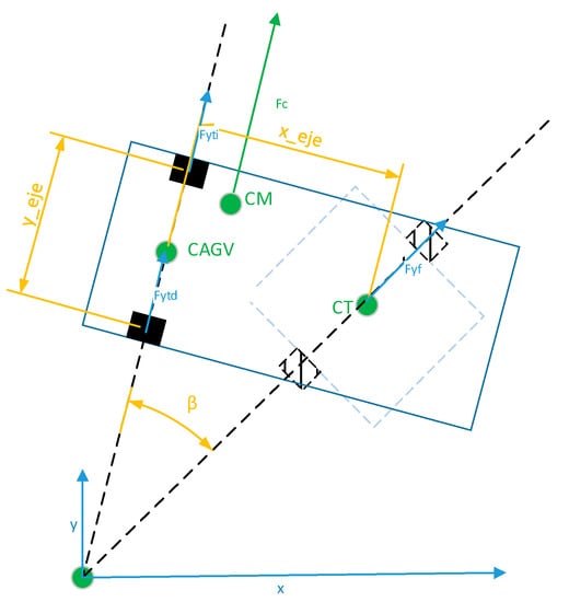 The mathematical equations of the model that are implemented in the algorithm are further explained in the following sections. Section 4.1 proposes different control implementation approaches. The dynamic model of each of the components of the AGV will be developed, that is, the drive unit (Section 4.2), the body (Section 4.3), and the trailer (Section 4.4). Finally, to complete the dynamics equations of the AGV, the loads on the wheels (Section 4.5 and Section 4.6) and the wheel-ground interaction (Section 4.7) will be calculated.