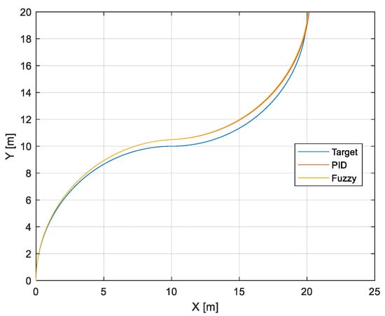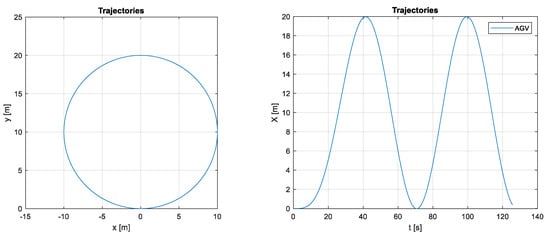 Some papers address articulated vehicles with trailers because these robots have some safety issues to be considered. These vehicles exhibit poor maneuverability and low lateral stability compared to heavy trucks and passenger vehicles due to their multi-unit structures, large sizes, and high centers of gravity. Rahimi and He studied active vehicle safety systems for articulated heavy trucks, that is, autonomous cars [19], and more recently, the same authors presented an autonomous driving control strategy for multi-trailer articulated heavy vehicles (MAHV) [20]. A non-linear model predictive control (NLMPC) is designed for direction and speed control of the vehicle. Following these lines, Deng et al. proposed an active linear quadratic regulator (LQR) multi-axle-steering method for MTAHV, but they do not work with AGVs [21]. In [22], the authors address the tracking control problem of a 16-wheel heavy-duty AGV, whose trajectory is based on magnetic navigation sensors. The vehicle model is simplified to a two-wheel AGV model. A trajectory tracking fuzzy control for circular/straight trajectories is simulated with MATLAB/Simulink to verify the effectiveness of the trajectory control.