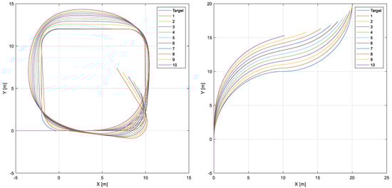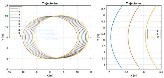 In order to study the influence of the number of trailers on the controller’s performance, different simulations have been carried out, changing the number of trailers. For each simulation, the mean squared error (MSE) of the guiding error (40) and the control effort (41) have been evaluated. It is important to reduce both metrics. Maintaining a low guiding error is key to ensuring correct positioning of the AGV and trailers in the work stations, to pick up and leave the parts, as well as to ensure a correct charging operation. On the other hand, the reduction in the control effort is necessary for avoiding degradation in its mechanical components and extending its life.