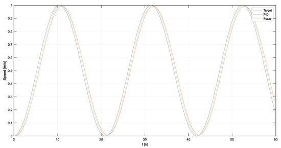 In Figure 5, the speed PID controller is substituted by a fuzzy logic controller (FLC). It receives the speed error and its derivative as inputs and obtains the signal as output. The rest of the scheme is the same as in Figure 4. The speed control must face uncertainties and disturbances, such as changing payloads, unknown frictions, etc.; hence, it may be interesting to use a fuzzy control to tackle these issues.