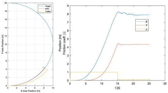 It is possible to observe how the lateral friction suffers a marked decrement around t = 15 s. Before this time, the AGV correctly followed the circular trajectory. However, when the lateral friction decreases, the AGV skids, hence producing a tracking error.