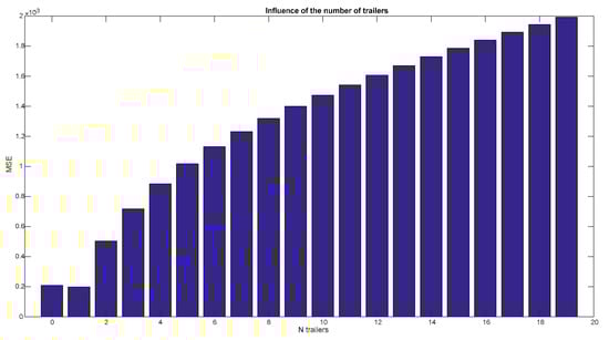 Figure 26 shows the growth of the MSE of the guiding error with the number of trailers. This guiding error is the error experienced after the traction unit of the AGV follows the pre-defined trajectory. This must not be mixed up with the error of each trailer commented in the previous sub-section. It is possible to see how the use of only one trailer hardly affects the error (the MSE value for zero trailers and one trailer is similar). However, when there is more than one trailer, the error grows, but not in a regular way. The differential increment is bigger at the beginning (from number 2 on), and it gets smaller and smaller up to a constant value (from 10 trailers on). It should be noted that this number cannot be increased indefinably, there exists a maximum number of trailers that depends on the maximum torque, the total payload, and the friction coefficient.