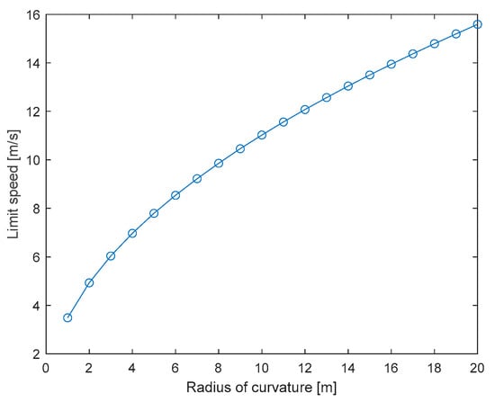 In Figure 30, the evolution of the limit speed with respect to the radius of the curve is represented. To obtain this figure, it has been assumed that the center of gravity is at h = 50 cm and cm, which corresponds to possible real values. Other assumptions would be possible for different curves.