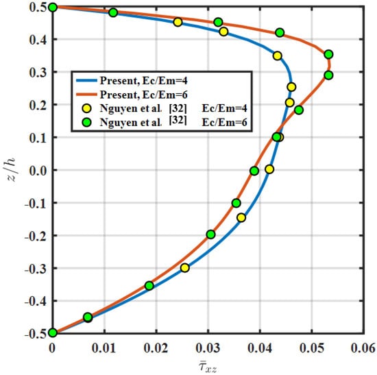 Figure 2 shows the variation of a transverse shear stress along the thickness direction for different elasticity ratios. As seen, the shear stress distribution has a parabolic variation with zero values at the top and bottom surfaces. The results are identical with those obtained by [3], which confirms and validates the current model.