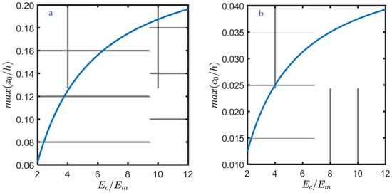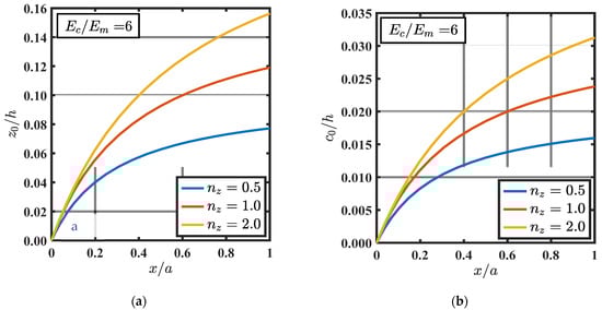 Neutral axis paramaters and at different and young’s modulus of ceramic and metal, = 6 at (a) for and (b) for .