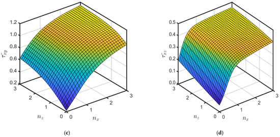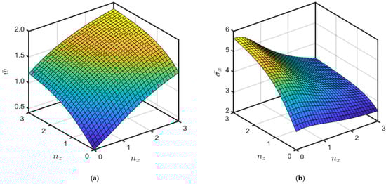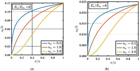 Due to the use of and defined by Equation (4) in the displacement field of Equation (1), the plate stiffnesses and are zero-valued. Subsequently, stretching–bending couplings in Equation (44) die out. Therefore, rigidity terms are modified as functions of x to: