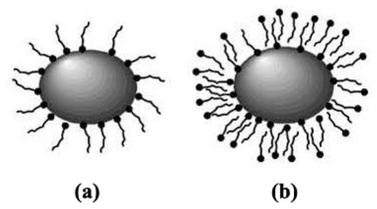 To avoid agglomeration, ferrofluid particles are coated [,]. Depending on the coating, ferrofluids are divided into two groups: surfactant-coated ferrofluids and electrostatically stabilized ferrofluids []. Surfactant-coated ferrofluids contain magnetic particles coated with amphiphilic molecules such as oleate to prevent aggregation. Spherical repulsion between particles acts as a physical barrier that keeps the particles in solution and stabilizes the colloid. If the particles are dispersed in a nonpolar phase, such as oil, the polar head of the surfactant is attached to the surface of the particles, and the hydrophobic chain is in contact with the liquid (Figure 1a). If the particles are dispersed in the polar phase such as water, a two-layer coating of the particles is required to form a hydrophilic layer around them (Figure 1b).