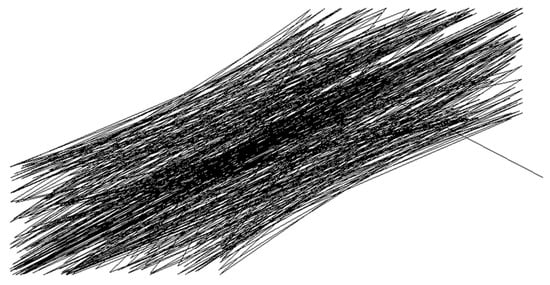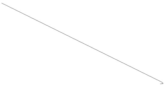 If we compare Figure 3, Figure 4, Figure 5, Figure 6, Figure 7 and Figure 8, it can be seen that trajectory shapes were significantly changed for slight changes in parameter p: a value of 1 resulted in a fully linear trajectory, while a value of 0.9 produced a fully random path. A further decrease in p to the lowest value, 0.5, again introduced patterns of linearity within chaotic motion. Since parameter p is related to the viscosity and particle radius and mass, it could be assumed that such transitional behavior with changes in p can be attributed to a complex phenomenon underlining dependencies between viscosity and volume fractions of particles in nanofluids, consistent with []. The rheological behavior of nanofluids is dramatically different for Newtonian and non-Newtonian nanofluids and dynamic transitions among these two modes, as influenced by the changes in viscosity are still not fully clarified. Figure 3 (with the highest p value) and Figure 8 (with the lowest p value) exhibit certain similarities in trajectory pattern, since both of these have fully linear parts of trajectories, in accordance with values in Equation (31). For values of p in between these numbers (Equation (31)), fully random trajectories were generated by simulation. However, for both of these regimes (random and linear trajectories), a decrease in p value produced a closer path (denser total trajectory), in accordance with the fact that viscosity decreases with the decrease in parameter p.