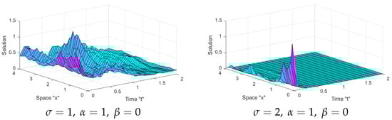 The impacts of white noise and the fractional derivative on the exact solutions of the SFSKdVE (1) are discussed here. According to the relevant studies [,,], nowadays, the destabilizing and stabilizing effects brought on by noisy terms in deterministic systems are well recognized. There is no longer any doubt that these effects are crucial for comprehending the long-term behavior of genuine systems. To illustrate the behavior of these solutions, we offer a variety of graphical representations. We simulated some figures for some of the solutions that were achieved, such as Equations (25) and (26) for different (noise strength). Let us first fix the parameters and . In addition, let and