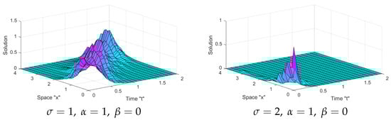 Second, the effects of the M-truncated derivative: In Figure 4 and Figure 5, we can observe that, if and , the surface moves to the left and shrinks when is decreasing: