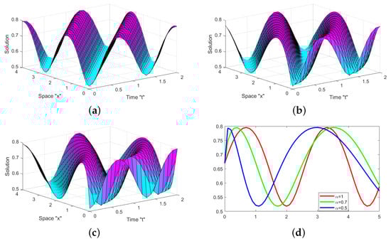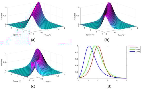 For Equation (25), (a–c) indicate the 3D profiles with , (d) denotes the 2D plot for different values of at , and the curves of the solution move to the left. (a) (b) and (c) .