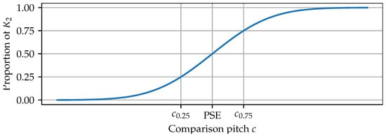 The just-noticeable difference (JND) also known as difference limen is often described as the minimal difference between two stimuli that can be noticed half of the time. Let us adapt the concise definition and method of computation from psychometric function analysis provided by [] to pitch changes. Suppose a subject is presented two succeeding tones as part of a pitch discrimination task. One of the tones is called the reference pitch p, the other the comparison pitch c. Responses and correspond to the choices and , respectively. There is no option . A small set of tone pairs are repeated a number of times (15 to 20), and the subject has to choose one of the two responses. A psychometric function models the proportion of either or . For a fixed reference pitch p the psychometric function for should be a monotonically increasing function in the comparison pitch c with values between 0 and 1, because for c much bigger than p the correct response should be obvious. We will assume for simplicity that the shape of the curve fitted to the data follows a cumulative Gaussian as in Figure 2, even though other functions such as sigmoid, Weibull, logistic or Gumbel are also a possibility []. The point of subjective equality (PSE) is the comparison pitch at which the two responses in this discrimination task are equally likely, i.e., the median. Then, the JND is defined to be half its interquartile range, i.e.,