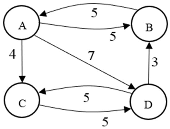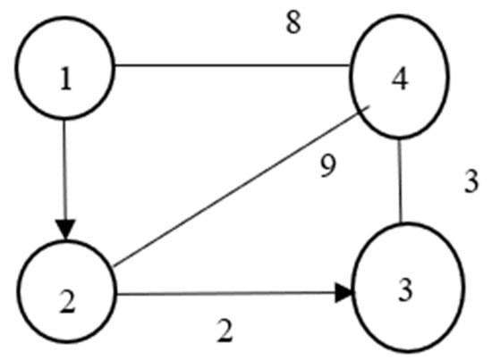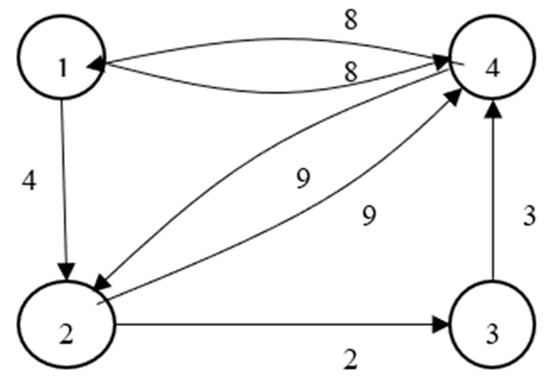 defines the initial distance matrix of the bidirectional graph of a semidirected network, and this matrix represents the direct connection of the edge between two nodes. Undirected connections are represented by .