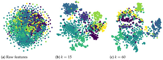 We analyze the sensitivity of parameters in our model. The unsampled model (5) involves the filter order k and the balance parameter . When k increases, nearby node features become similar. However, too large k will lead to over-smoothing, where the features of nodes in different clusters are mixed and become indistinguishable, harming the performance. In fact, over-smoothing is commonly seen in GCN and is intensively studied recently. To visualize it, we use t-SNE on Cora’s raw and filtered node features in Figure 1. We can see clear cluster patterns at , but the cluster structures vanish when the features are oversmoothed at . The impacts of k and on clustering performance are shown in Figure 2. A small k range and a wide range can produce a rational outcome.