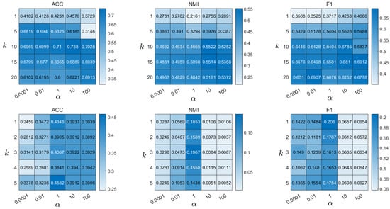 The influence of parameters k and on results of Cora (first row) and Large Cora (second row) datasets in FGC.
