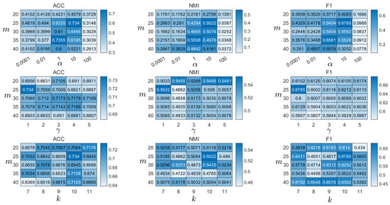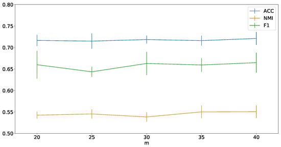 The sampling-based model (7) has several parameters to tune, including the balance parameter , the filter order k, the sampling parameter , and the number of anchors m. We show the clustering results under various parameter values in Figure 3. To obtain each value, we fix two parameters and tune the other two. We can see that our method works well for a wide range of parameter values. Specifically, it can be seen that the results are sensitive to , which indicates that it is important to find a good balance between attribute and structure information and that exploiting only one type of information could not achieve the best performance. Besides, k is less sensitive compared to the unsampled approach, which is a reasonable result because only a small part of the nodes are chosen. does not have too much impact on the results, which makes parameter tuning easy. To better visualize the influence of the anchor number, we all fix m and tune other parameters. From Figure 4, we can find that m has a small influence. In principle, m could not be less than the number of clusters. By contrast, too large m will make the anchors less representative.