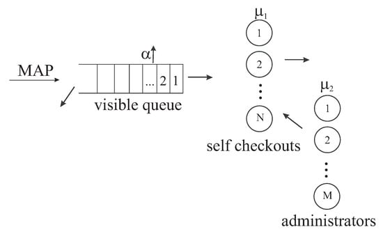 In modern retail networks, hotels, banks, airports, etc., there is a robust trend for extending the use of self-service devices () or self-checkouts. s have been defined by the new technological interfaces (e.g., the Quick Response (QR) codes, image and face recognition, radio frequency identification (RFID)) that allow customers to produce services without a service employee’s involvement, see, e.g., []. The human operator (administrator, assistant, etc.) is involved in the service only upon request of a customer who asks for help in resolving certain problems that he/she met during a service or in the case of violation of the established rules by a customer. The use of is becoming very wide nowadays, in particular, in many retail networks worldwide due to many reasons. The main reason is that it is profitable for both owners of services and customers.