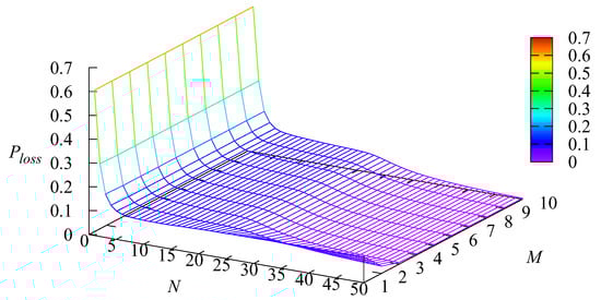 The dependence of the loss probability of an arbitrary customer on the parameters N and M is presented in Figure 10.