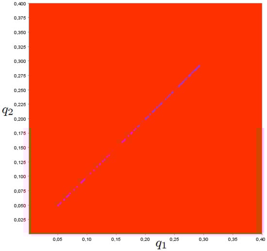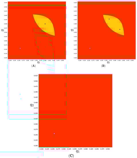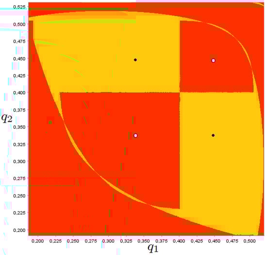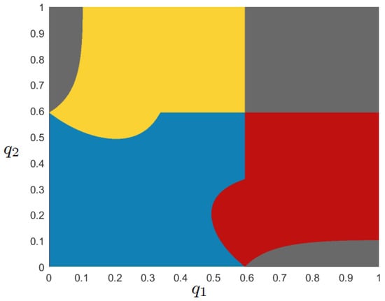 Figure 1 shows (with different colours) the fate of the trajectories according to the region of the plane where they start. Specifically, trajectories starting from the blue region remain in this area for each iteration and, depending on the initial condition of the system, they converge to one of the attractors of the map; differently, trajectories starting in the yellow or red regions lead to the closure of one (and only one) of the two markets ( from a given t onwards); finally, the dark-grey region describes the initial conditions leading to the closure of both markets ( from a given t onwards). Though from an economic point of view this solution can be explained by the absence of coordination between the two managers, the scenario in which one of the markets will close is not robust as it would be enough for the manager operating in this segment choosing to produce a quantity () slightly larger than zero to let both segments remain open. From a mathematical point of view, this result is motivated by the fact that the attractors located on the axes are in general weak attractors in the Milnor sense (see [31]). For the value of k selected for Figure 1, the immediate basin of attraction of the attractors on the axes intersected by the positive orthant is the empty set. As the parameters vary, including k, it is possible to observe much more complex configurations of the basins. In this case, the mechanism of re-entry into the market in one of the two segments can give rise to complex phenomena, with trajectories involving a sequence of periods of activity/inactivity of one of the segments. This point has been explored in depth by [32], to which we refer to for details.