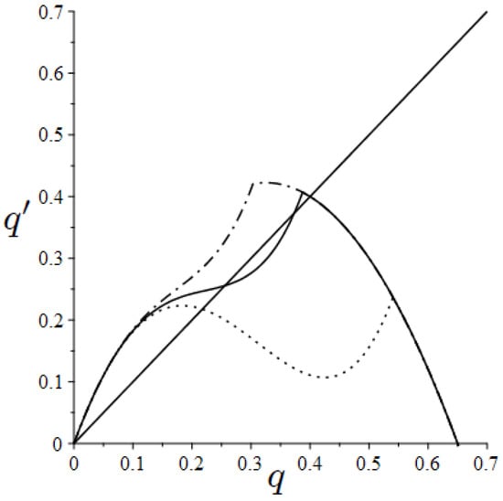 Stationary points as varies. Parameter set: , and ; (dashdotted line), (solid line), (dotted line).