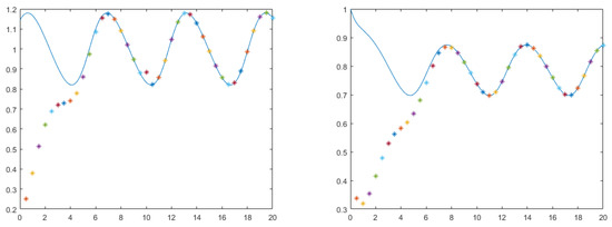 The function , as it is easy to check, is in accordance with the hypothesis of the theorem. We find the solution of the second ODE of (2) and (13) by numerical integration using the ode45 function of Matlab R2019a. In Figure 1, the solution is presented for 0, 0.5, 1 and 20 s. Table 1 shows the norm of the discrete solution and the value of for different times. In Figure 2 we illustrate the asymptotic solution (solid line) and the value of the discrete solution for times in .