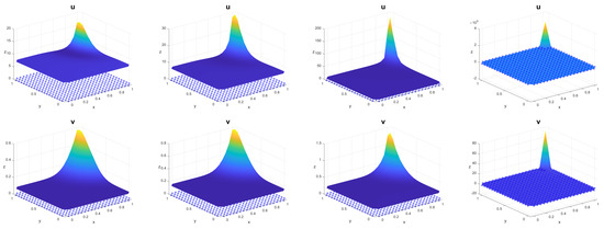 Next in order we present the results for the explosion of solutions in the case that certain hypotheses of Theorem 2 are not verified. We choose and . The initial data used are