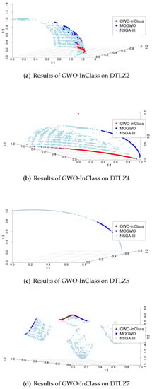 - Considering DTLZ5 and DTLZ9: Like in the case of GWO-InClass, no advantage was observed in DTLZ9. Additionally, this situation also occurred in DTLZ5.