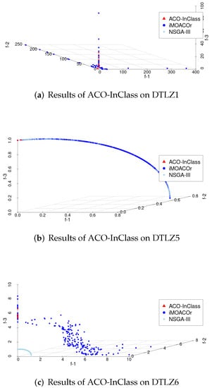 - Considering three and five objective functions: With the only exception of a specific setting (DTLZ6, average Euclidean distance, and ), ACO-InClass was at least as good as regardless of the number of objectives.