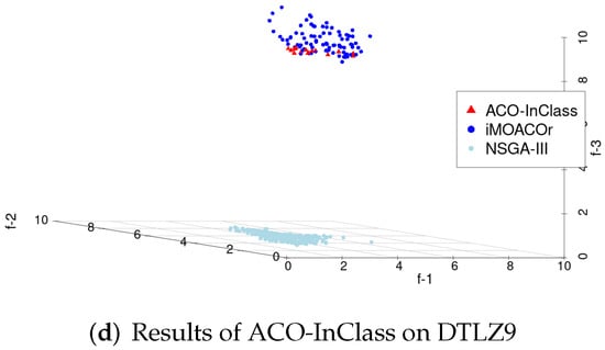 - Considering ten objective functions: The advantage of embedding ordinal classification became statistically significant only when . Taking DTLZ1–4 and DTLZ6–8, ACO-InClass outperformed in at least one indicator, performing especially well in DTLZ1, DTLZ3, DTLZ6, and DTLZ8.